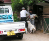 オスを種用に欲しいというので「そろそろいいかな」と朝電話をしたら、すぐに連れに来てくれました。いっぱいお乳を飲んで、草を食べて、さんざんあそんで親子でよりそって休んでいるところを、抜き打ちで抱き上げてあっという間のお別れでした