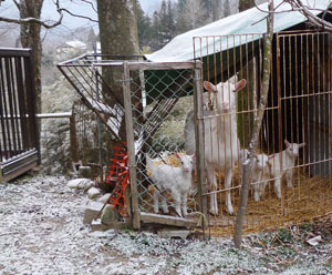 今年は早い出産だったので、生まれた後に雪が積もったり氷が張る日が続きました。青草もなかなか伸びす、母ヤギは産後もしばらく豆がらと干し草で耐えました。